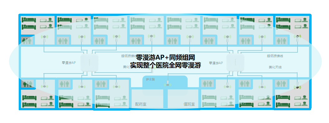 采用(yòng)零漫遊AP,1個(gè)AP覆蓋多(duō)個(gè)房(fáng)間(jiān),并采用(yòng)同頻(pín)組網方案,實現(xiàn)‌零漫遊AP之間(jiān)無縫切換,對(duì)于終端來(lái)說(shuō)不(bù)存在斷線重連,從(cóng)而實現(xiàn)真正的€(de)醫(yī)療零漫遊。