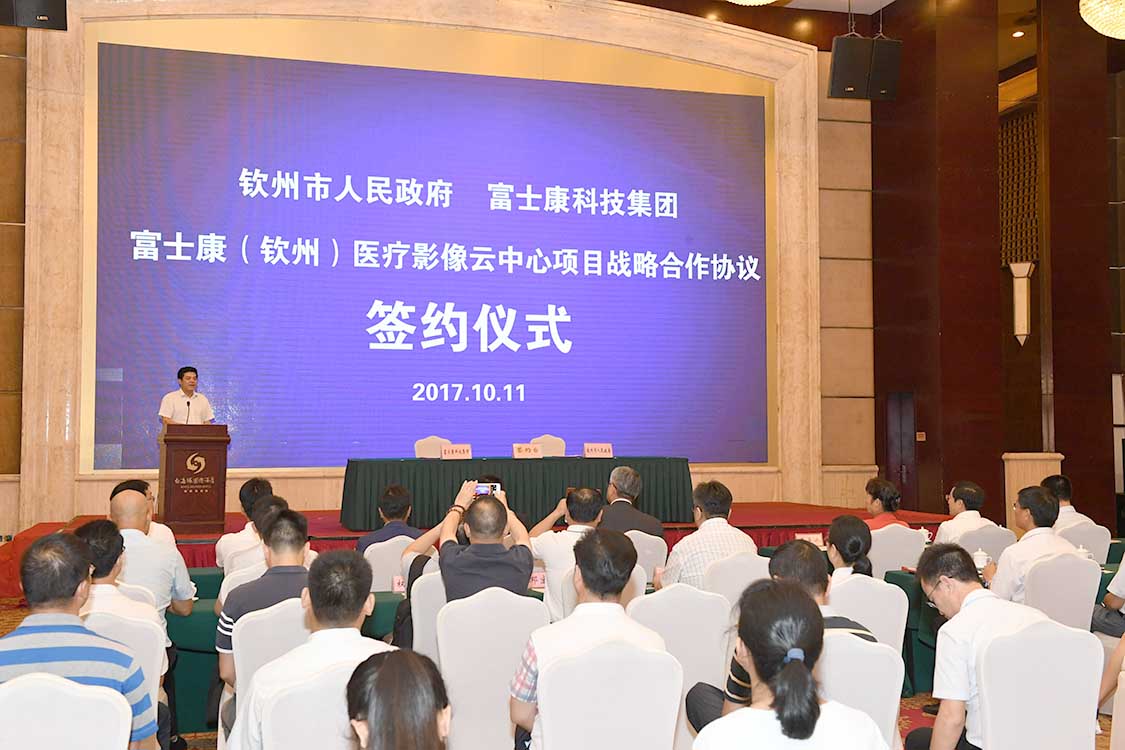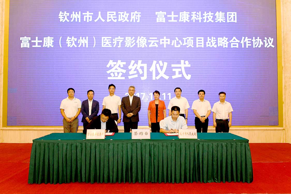10月(yuè)11日(rì),富士康科(kē)技(jì)集團總經理(lǐ)鄭弘孟和(hé)公司智聯雲網總經理(lǐ)王進率隊到(dào)廣西(xī)®欽州市(shì)參觀考察,深圳雲科智聯科技有限公司與欽州市(shì)政府簽屬《富士康(欽州)醫(yī)療影(yǐng)像雲中心項目戰略合作(±zuò)協議(yì)》,欽州市(shì)市(shì)委書(shū)記王革冰、市(shì)長(cháng)黃(huáng)海(hǎi)昆參加座談會(huì)并見(jià₽n)證簽約。